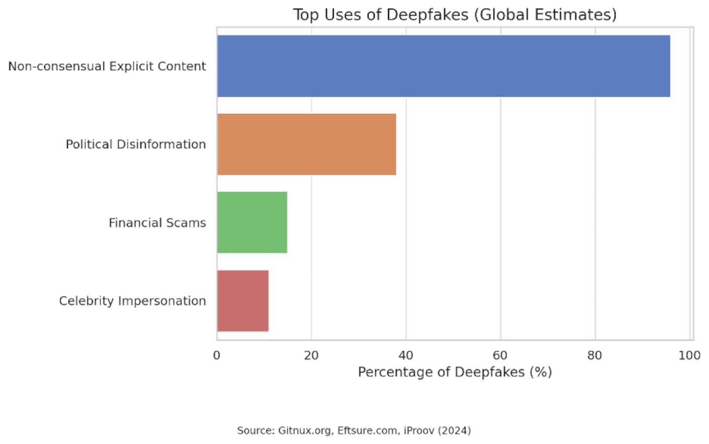 - 96% of deepfake content online is non-consensual explicit material, often targeting women without their knowledge.