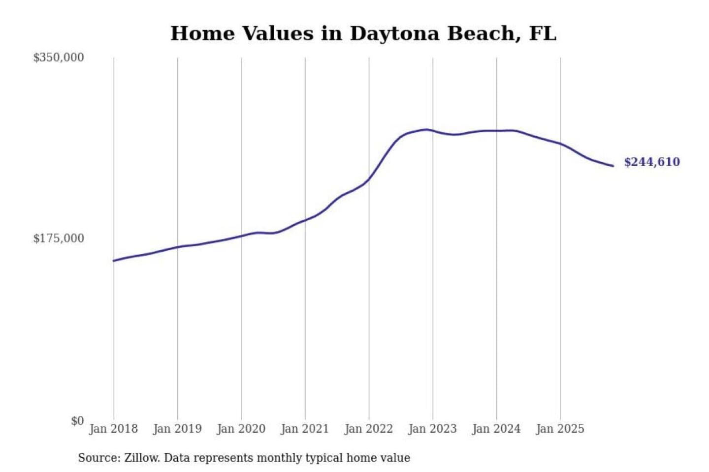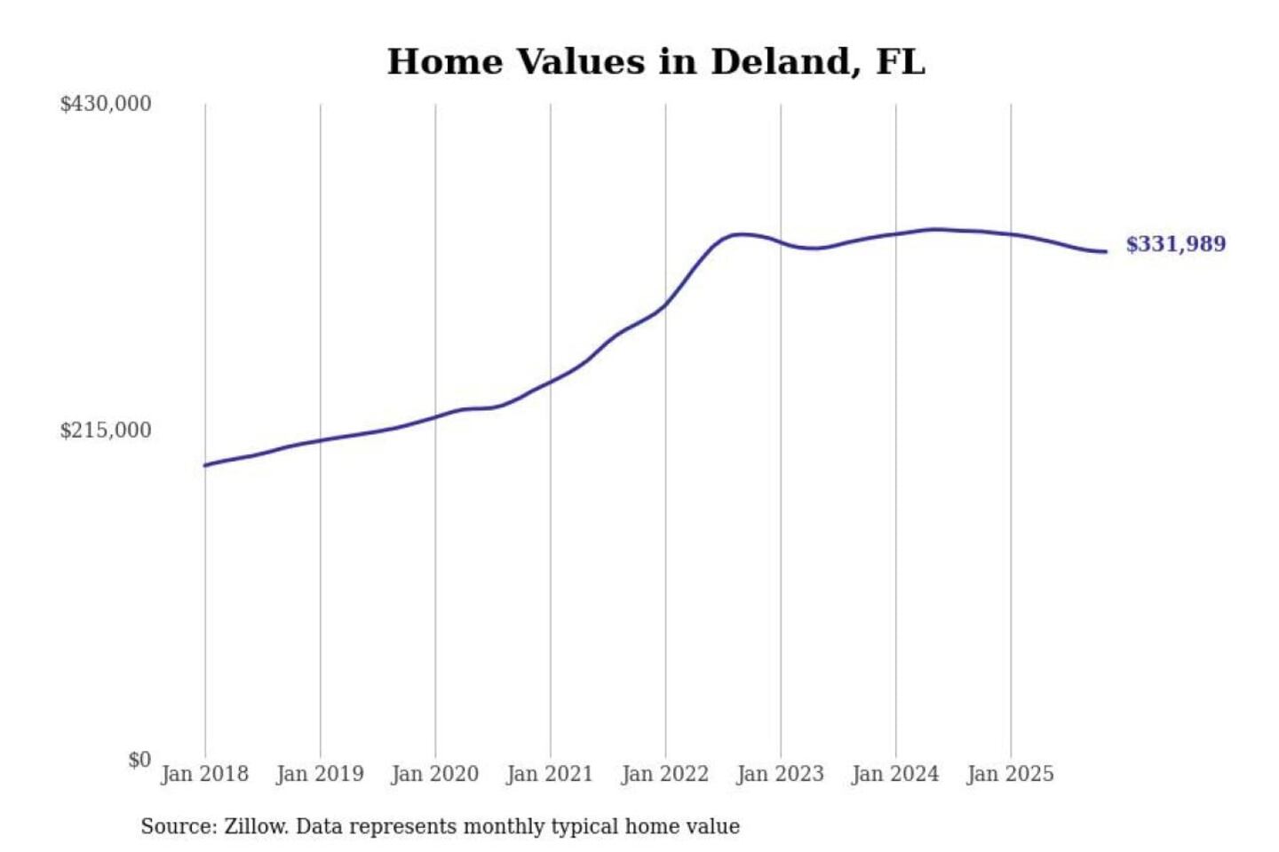 Stacker compiled a list of cities with the most expensive homes in the Deltona-Daytona Beach-Ormond Beach, FL metro area using data from Zillow. Charts show the monthly typical home value since January 2018.