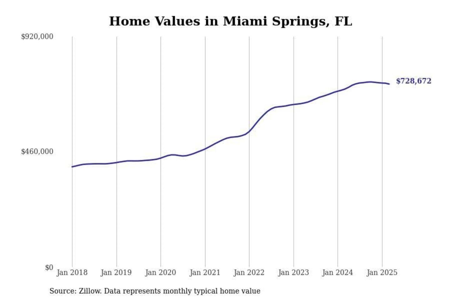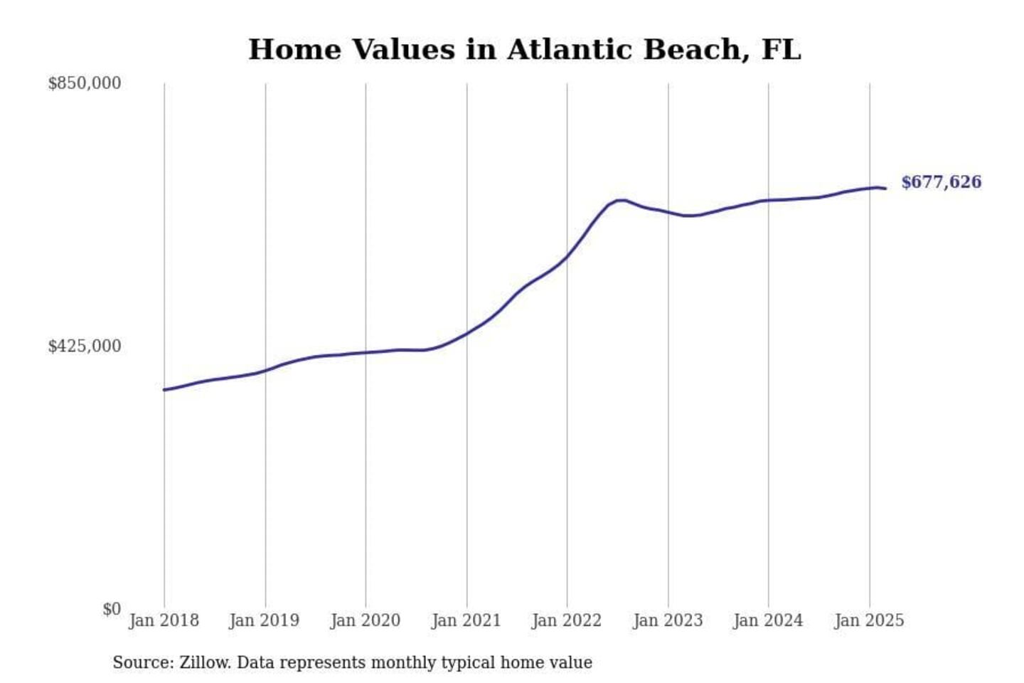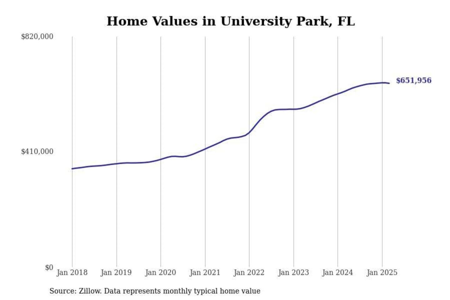 Stacker compiled a list of cities with the fastest-growing home prices in Florida using data from Zillow. Cities are ranked by the dollar change in the Zillow Home Values Index for all homes from the 12 months ending March 2025. The charts in this story were created automatically using Matplotlib. Data was available for 50 cities and towns in Florida.