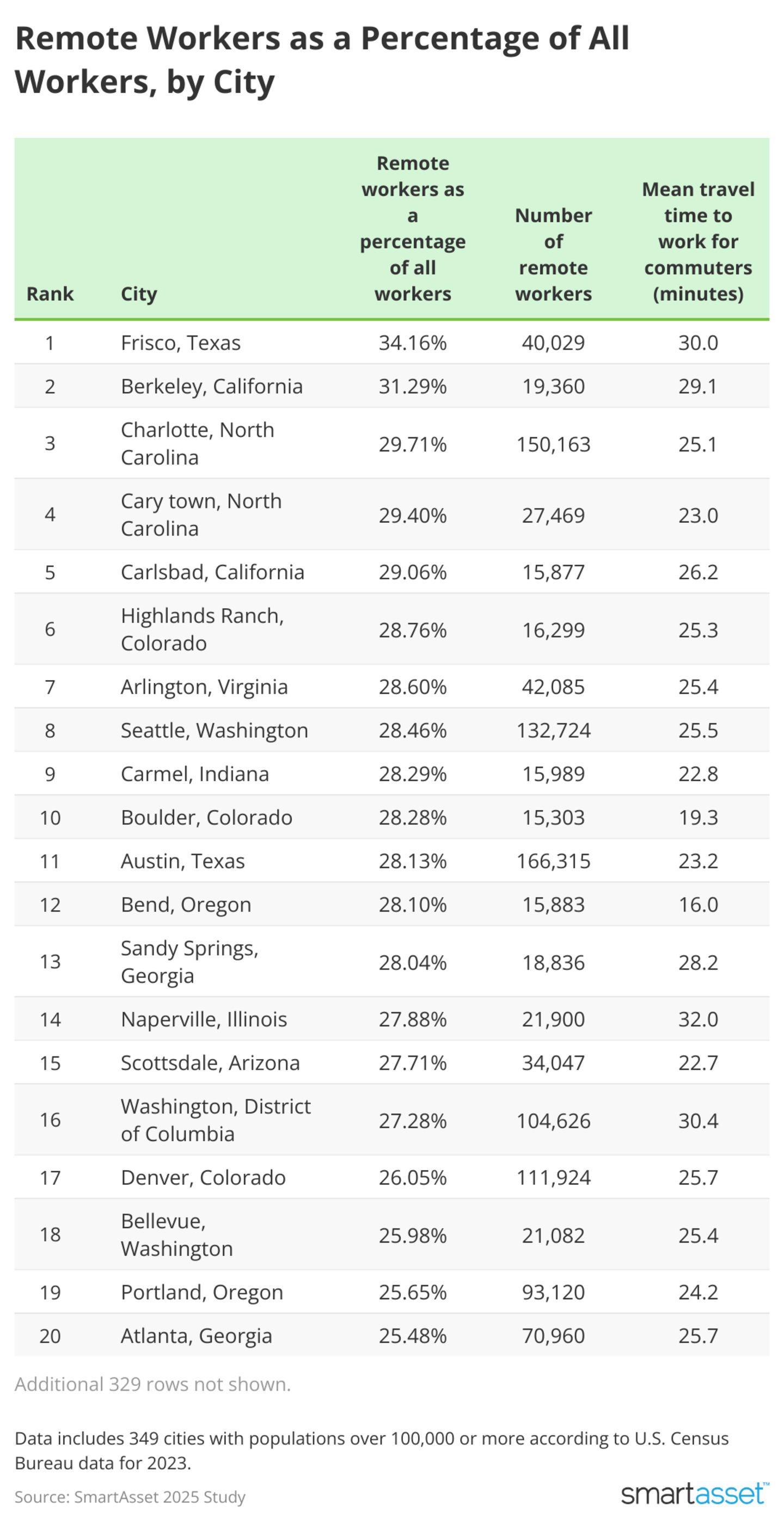 - More than 25% of the workforce is remote in 22 cities. This includes Charlotte, NC (29.71%); Arlington, VA (28.60%); Seattle, WA (28.46%); Boulder, CO (28.28%); Austin, TX (28.13%); Scottsdale, AZ (27.71%); Washington, DC (27.28%); Denver, CO (26.05%); Bellevue, WA (25.98%); Portland, OR (25.65%); and Atlanta, GA (25.48%).