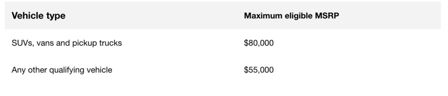 The following price caps by vehicle type became effective as of Jan. 1, 2023, and refer specifically to the manufacturer's suggested retail price (MSRP). It does not include the manufacturer's destination charge, optional items added by the dealer, or taxes and fees. For example, if you're looking at an SUV with a $79,990 MSRP, and the destination fee takes it over $80,000, the vehicle is still eligible. If, for example, the vehicle is priced above the MSRP limit (let's say $82,000), but there's a manufacturer incentive that brings it back down to $80,000, the vehicle would also not be eligible.