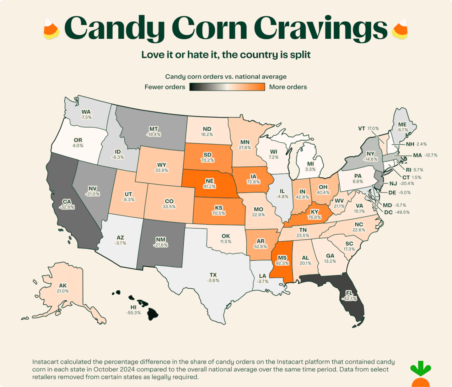 - The least enthusiastic: On the flip side, Hawai'i ordered candy corn 55% less often than average, followed by Washington D.C. (-50%) and Florida (-43%).