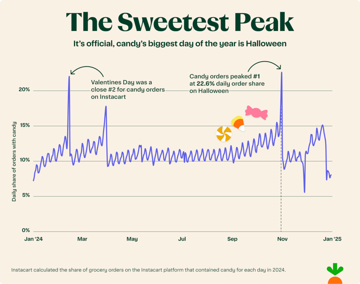 Halloween is, unsurprisingly, a big day for candy purchases. On October 31, 2024, the share of orders with candy was 100% higher than the yearly average. Now that's a sugar high!