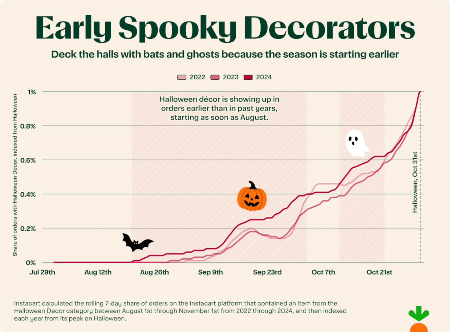 It's not just candy that marks the start of spooky season — decorations set the tone too. Instacart data shows that in 2024, households began decking out their homes earlier than in years past. While 2022 and 2023 didn't see a real pickup until the week of September 7, last year, consumers were already adding Halloween decor to their carts by the week of August 24. So if it felt like those inflatable ghosts and giant spiders showed up sooner than usual, you were right.
