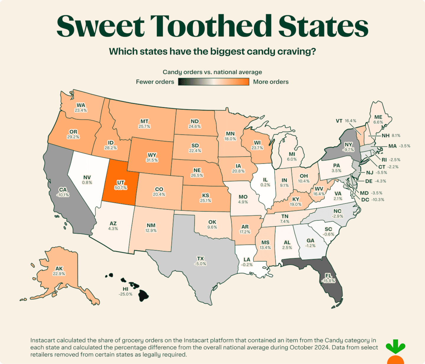 Who loads up on candy the most? Since Utah's first full year on the Instacart platform, Utah has once again decisively claimed the crown, buying candy 50% more often than the national average in October 2024. The Mountain West and Midwest dominated the leaderboard, with Wyoming, Oregon, Idaho, and Nebraska rounding out the top five. On the flip side, states like Hawai'i, Florida, and California purchased candy at rates well below the national average — proof that America's sweet tooth isn't evenly shared.