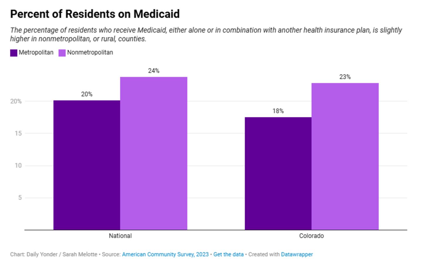 In Colorado, 23% of the nonmetropolitan population and 18% of the metropolitan population received Medicaid in 2023, according to a Daily Yonder analysis of Census data.