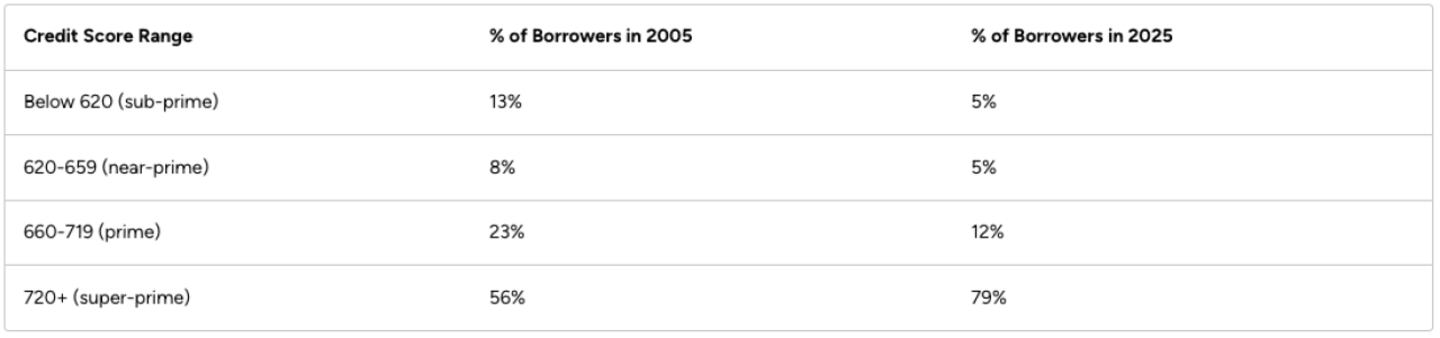As an illustration, here are the credit scores of mortgage borrowers in 2005 and 2025: