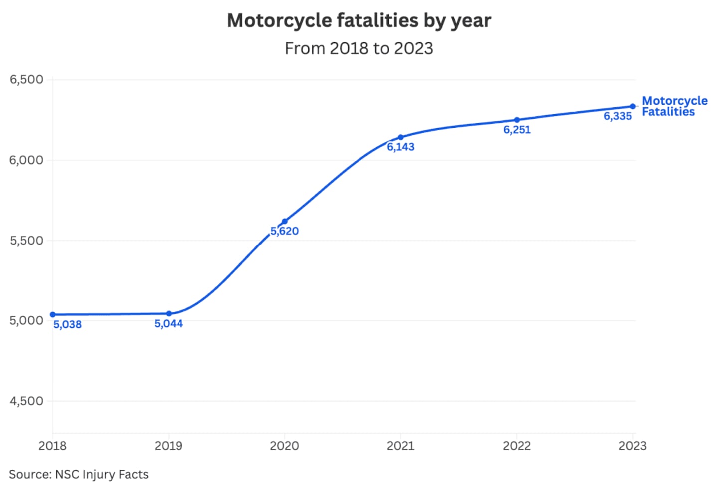The National Highway Traffic Safety Administration reported there were 6,335 motorcyclists killed in 2023, an increase from 6,251 in 2022 and a significant jump from fewer than 3,000 in 2000, according to data released in July 2025. The trend is clear. Motorcycle fatalities are on the rise, and legislators, governmental bodies, and the general public are becoming increasingly concerned.