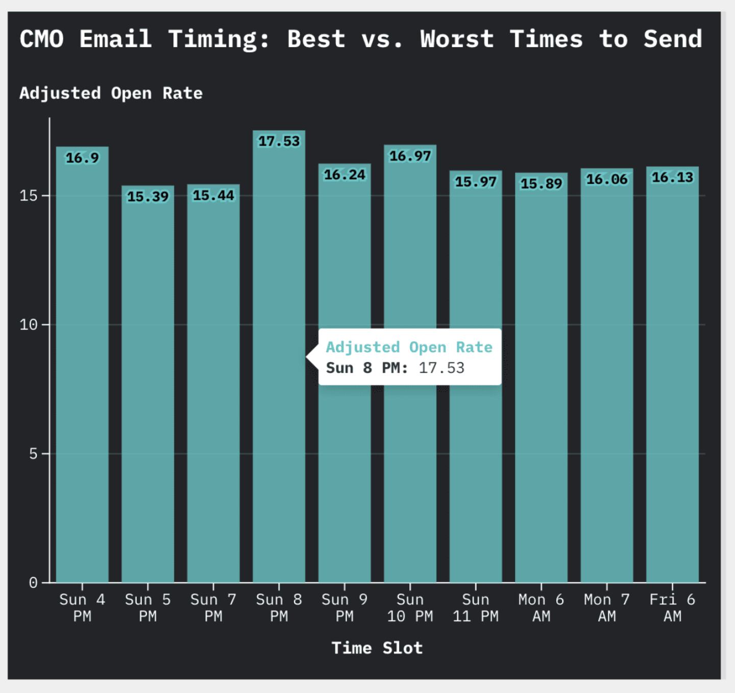 The data shows CMOs demonstrate highest engagement on Sundays between 4 p.m. and 10 p.m., with open rates reaching 17.53%. This timing aligns with their preparation for the upcoming week, when they're strategically planning and reviewing important communications.