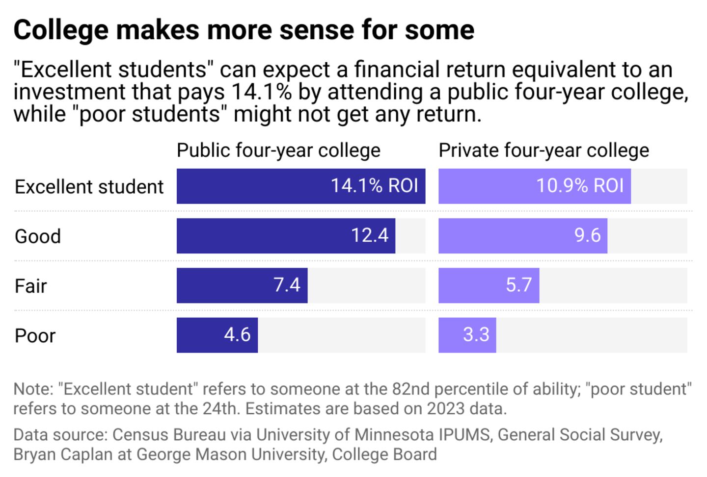 Overall, this analysis finds that college is a good bet, at least for those with a good academic record. Excellent students can expect an ROI of about 14.1% at public four-year colleges, while poor students can expect only a 4.6% return. For comparison, the S&P 500 Index, which tracks the performance of shares in the biggest listed companies in America, has provided a total return of around 10% a year over the past three decades.