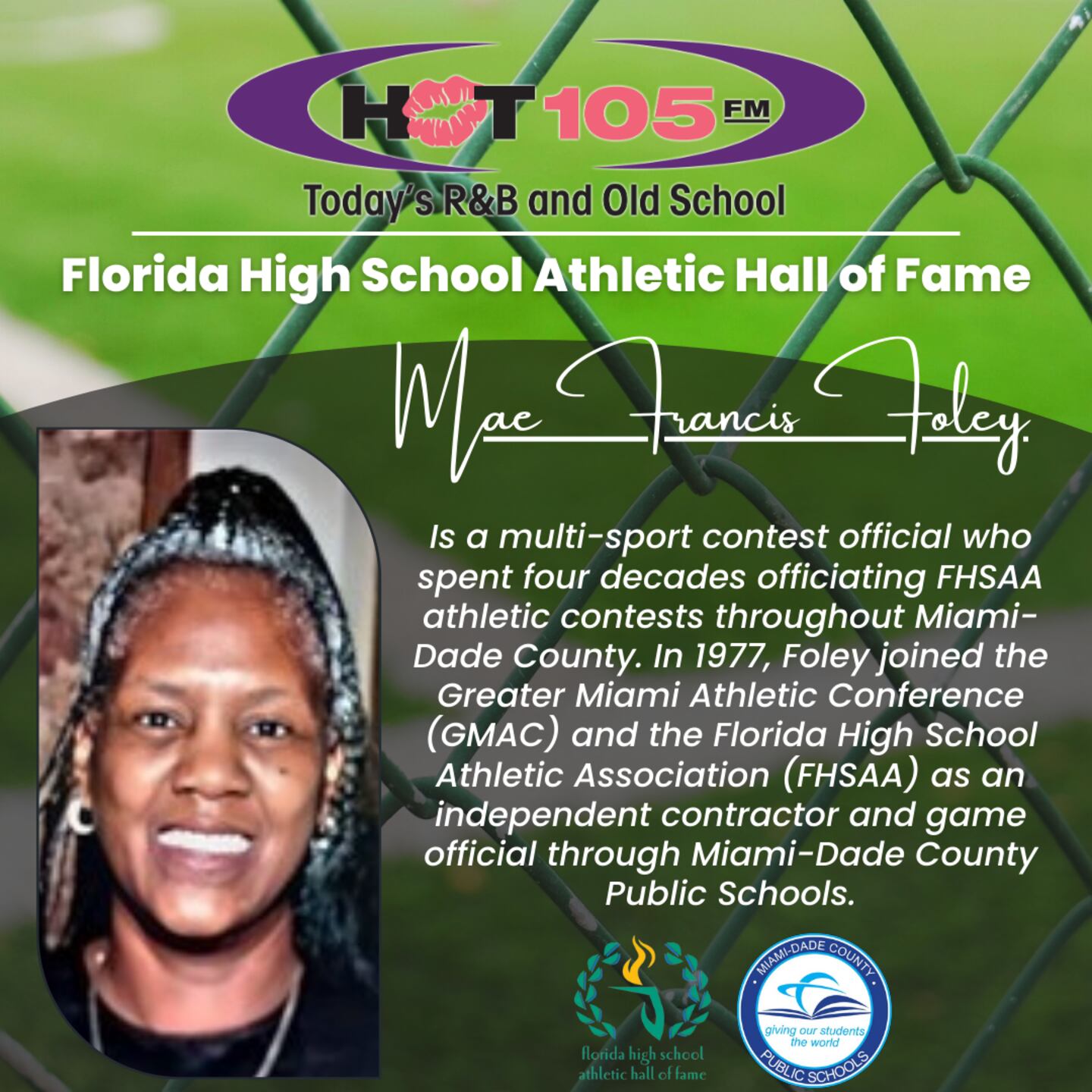 Mae Francis Foley, a multi-sport contest official who spent four decades officiating FHSAA athletic contests throughout Miami-Dade County. In 1977, Foley joined the Greater Miami Athletic Conference (GMAC) and the Florida High School Athletic Association (FHSAA) as an independent contractor and game official through Miami-Dade County Public Schools. Foley registered as a three-sport official in volleyball, basketball, and softball in which she officiated hundreds of games. Foley has officiated 14 State Championship contests and since 2020, she has been the Assistant Basketball Booking Commissioner for the Miami-Dade Basketball Officials Association. Foley has numerous accolades which include the 2021-2022 FHSAA Certificate for 40 years of Meritorious Service.