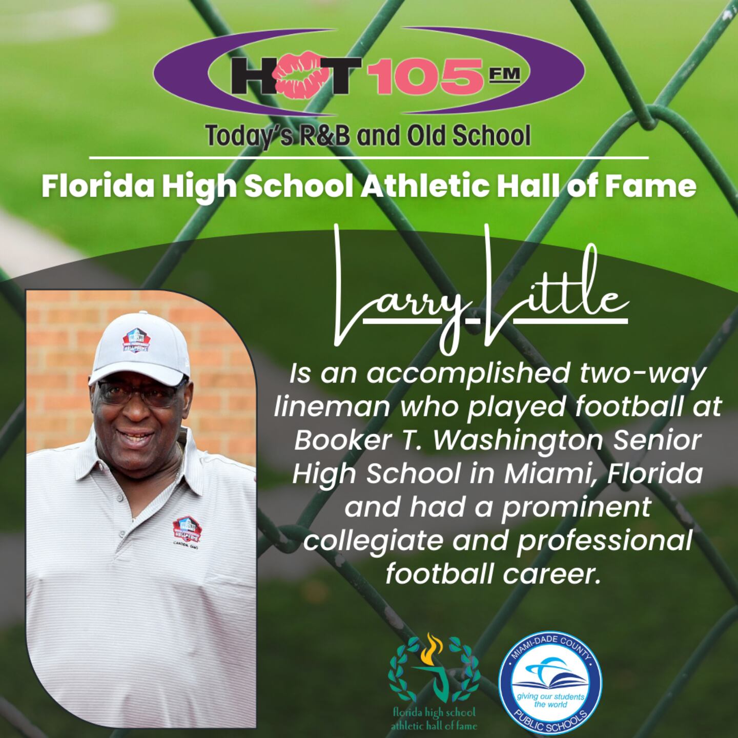 Larry Little, an accomplished two-way lineman who played football at Booker T. Washington Senior High School in Miami, Florida and had a prominent collegiate and professional football career. Little attended Bethune-Cookman College from 1964-1967 and played on both sides of the ball as an offensive lineman and defensive lineman. Little was a three-time All-Southern Intercollegiate Athletic Conference (SIAC) selection. Little’s professional career is highlighted by helping the Miami Dolphins become of the NFL’s most dominant teams in the 1970s. As Little was praised as one of the NFL’s premier offensive linemen, he was a key piece of the Miami Dolphin’s historic undefeated 1972 NFL season. Little was named First-Team All-Pro five times from 1969 to 1975, played in five Pro Bowls, and was named the NFL Players Association’s AFC Offensive Lineman of the year three times. Little was enshrined in the Pro Football Hall of Fame in 1993 and was selected to the NFL’s 1970s All-Decade Team.