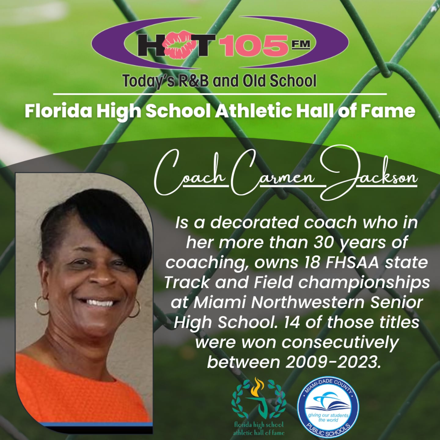 Carmen Jackson, a decorated coach who in her more than 30 years of coaching, owns 18 FHSAA state Track and Field championships at Miami Northwestern Senior High School. 14 of those titles were won consecutively between 2009-2023. She was named Florida Interscholastic Athletic Association Coach of the Year four times, the Florida Athletic Coaches Association Coach of the Year five times, the Florida Dairy Farmers Coach of the Year 10 times and has been named the Miami Herald Track Coach of the Year 19 times. Jackson was inducted into the National High School Athletic Coaches Association Hall of Fame in 2022.