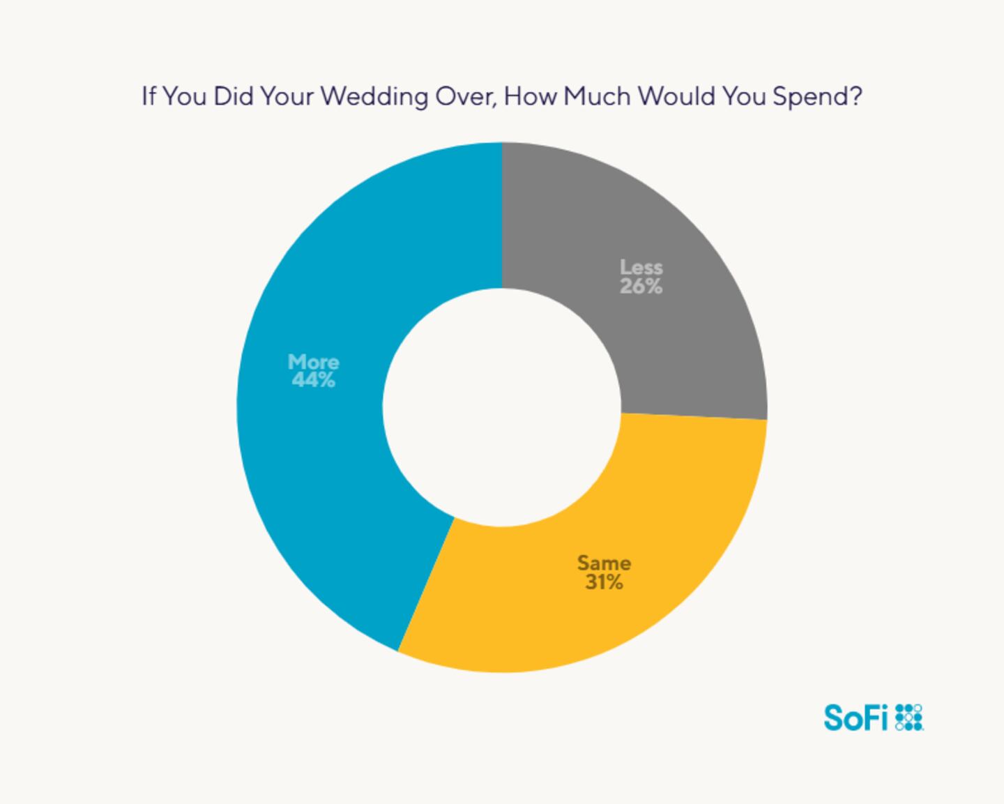 Weddings are notoriously expensive (averaging around $33,000). So it’s not surprising most respondents took on debt to pay for their big day. What is: A full 43% said they wish that they had spent more on their big day. Around 30% said they would spend less, and 31% would spend the same.