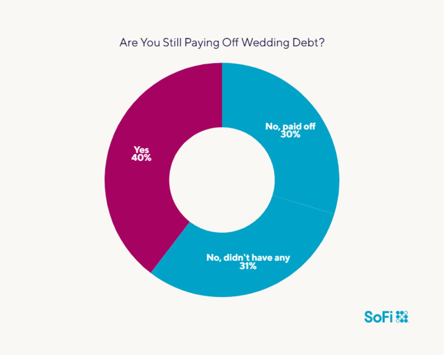 Approximately 4 in 10 survey participants are in the process of repaying the debt they incurred from their wedding. The good news is that many couples pay it all off within the first year of marriage. Among newlyweds polled: