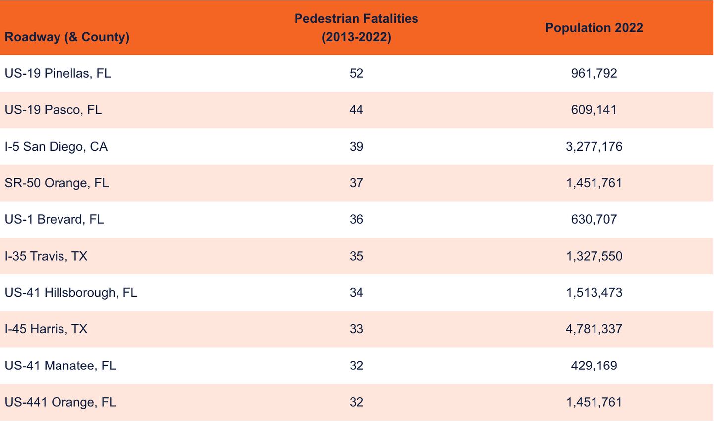 Even when looking at total pedestrian fatalities (and not per capita), only three of the top 10 most populated counties appear on the top 10 list of most dangerous roads. In fact, four of the most dangerous roads in the country are in counties with populations under 1 million residents.
