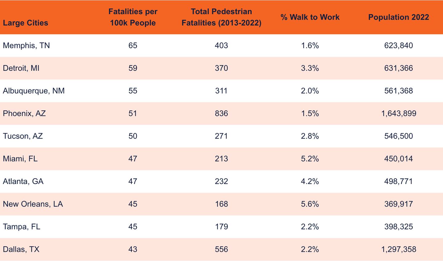 Among large cities with a population over 350k, Memphis, Tennessee, is the most dangerous city for pedestrians with 65 pedestrian fatalities per 100k.