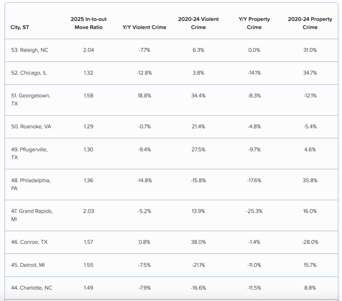 With an average in-to-out move ratio of 1.55—lower than the top 10’s 1.73—these 10 cities have struggled to reduce crime as effectively over the past four years. While slightly less popular than their safer counterparts, they still attract many new residents.