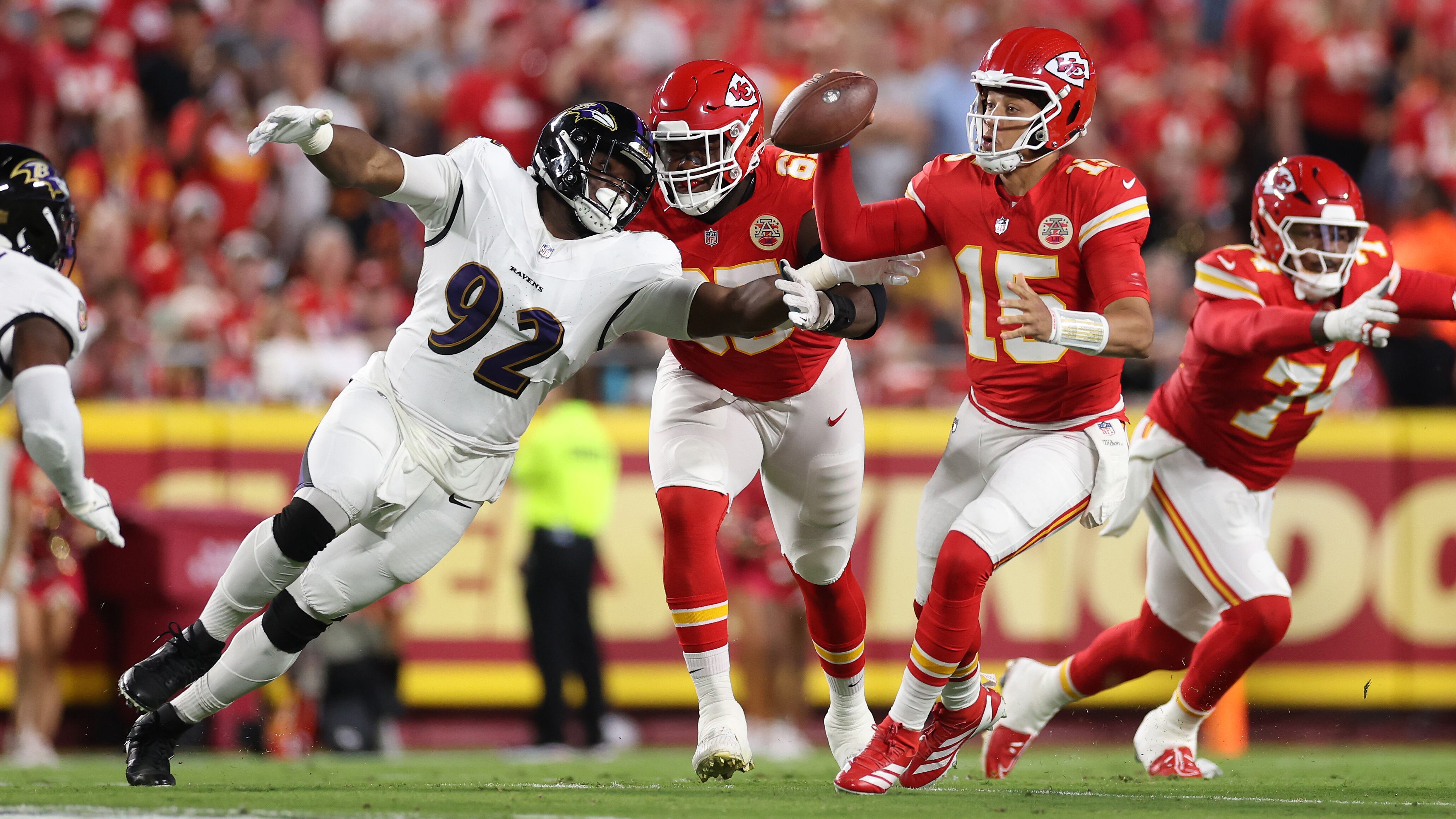 Baltimore Ravens v Kansas City Chiefs KANSAS CITY, MISSOURI - SEPTEMBER 05: Quarterback Patrick Mahomes #15 of the Kansas City Chiefs looks to pass against Nnamdi Madubuike #92 of the Baltimore Ravens during the first quarter at GEHA Field at Arrowhead Stadium on September 05, 2024 in Kansas City, Missouri. (Photo by Christian Petersen/Getty Images) (Christian Petersen/Getty Images)