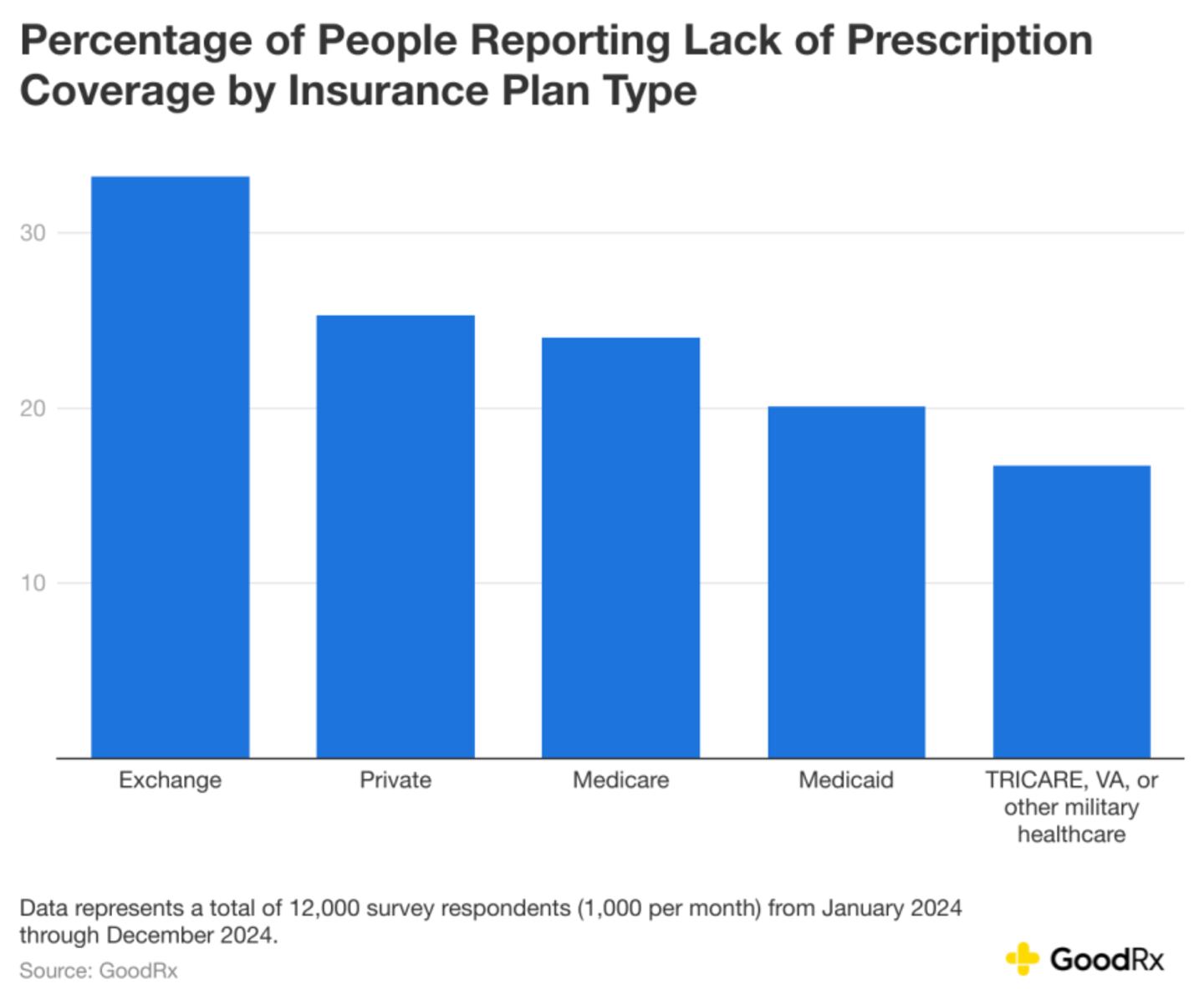 As it turns out, individuals who rely on the Affordable Care Act health exchange insurance plans have poorer coverage compared to other plan types. Among those on health exchange plans, 34% report a lack of prescription coverage. People with Tricare, Veterans Affairs (VA) insurance, or other military insurance have the highest rates of prescription coverage.