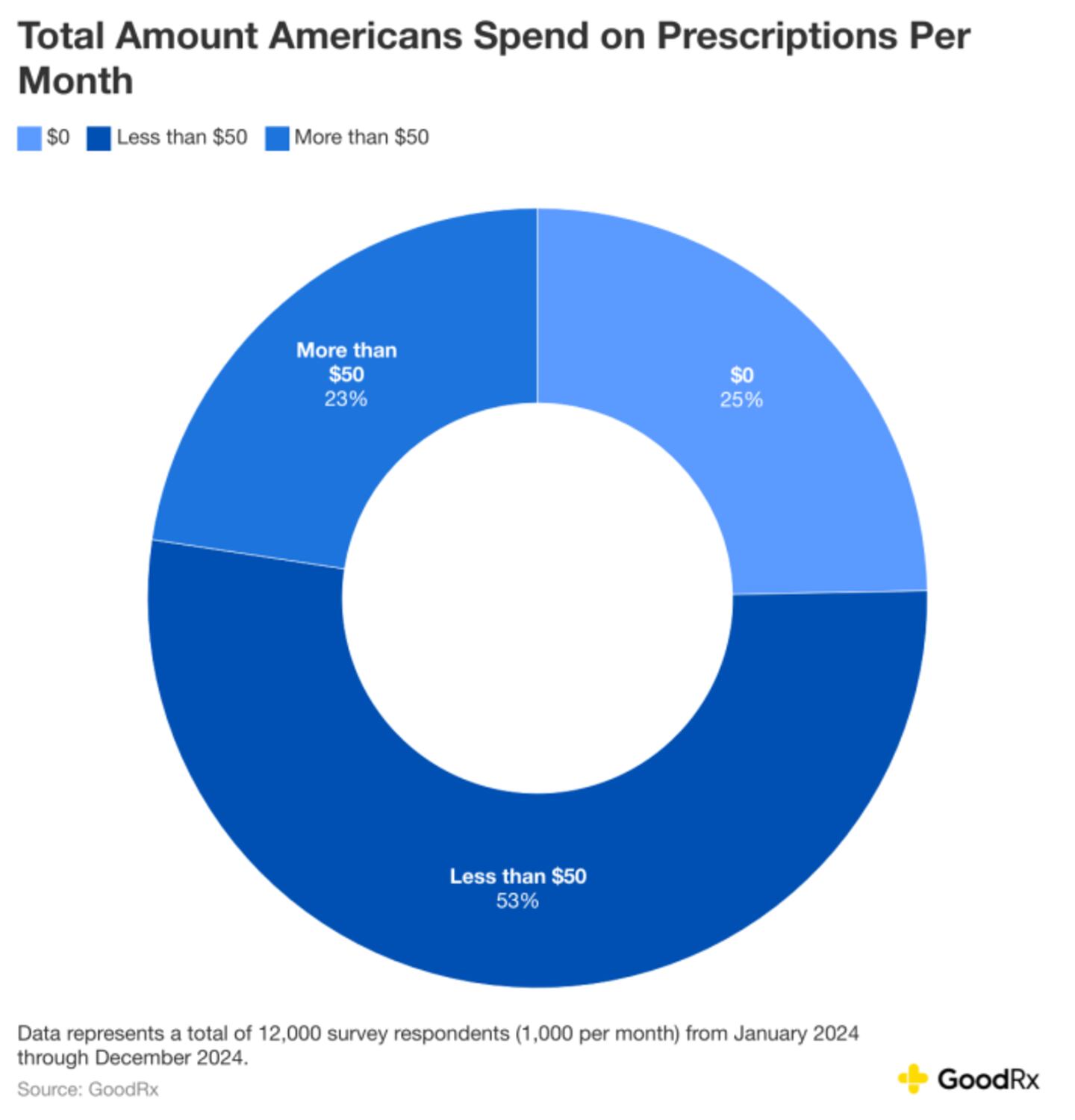 GoodRx Research found that 23% of people spent more than $50 on their prescriptions per month (after removing respondents with Medicaid coverage). And nearly 10% reported spending over $100 on their prescriptions in the most recent month.