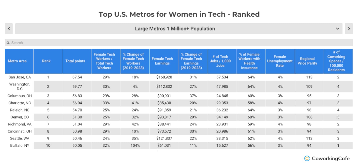 Emerging as a rising tech hub in the Midwest, Columbus, Ohio, continues to gain traction as an attractive destination for women in tech. In fact, Columbus leaped 10 positions in the ranking to settle into third place. With 29% of tech jobs held by women, the metro is making steady progress in gender representation within the industry. This surge has been driven by major investments from Amazon, Intel, and Google, which are transforming the metro into an emerging tech hub and fueling demand for highly skilled talent.
