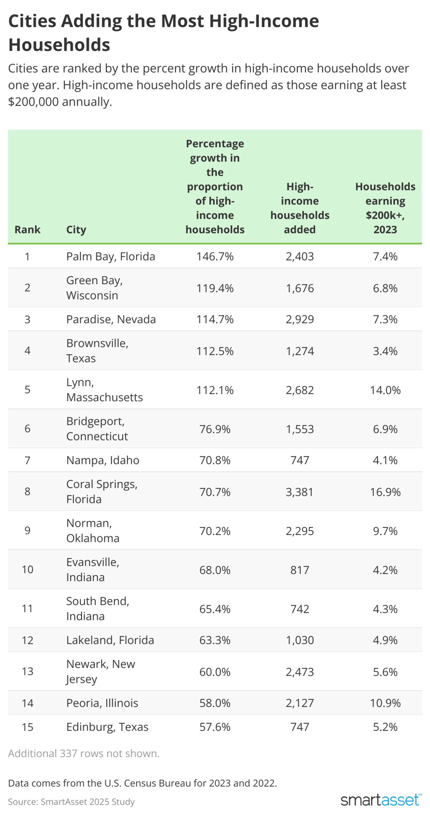 With this in mind, SmartAsset ranked 352 U.S. cities based on the percentage change in the proportion of households earning $200,000 or more annually over one year. Other data examined includes the new estimates of high-earning households, the number of high-income households added, and the local median income.