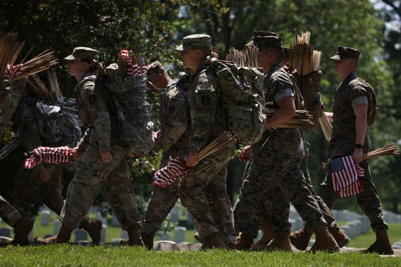 Arlington Cemetery flags ARLINGTON, VIRGINIA - MAY 27: Service members walk through Arlington National Cemetery carrying small American Flags for the “Flags In” ceremony ahead of the Memorial Day weekend on May 27, 2021 in Arlington, Virginia. For the first time in 20 years, members from all joint services worked to place flags at each of the 260,000 headstones in the cemetery. Arlington Cemetery recently announced they would be relaxing the visitor restrictions imposed at the beginning of the coronavirus (COVID-19) pandemic, which has affected ceremonies and traditions over the last year. (Photo by Anna Moneymaker/Getty Images) (Anna Moneymaker/Getty Images)
