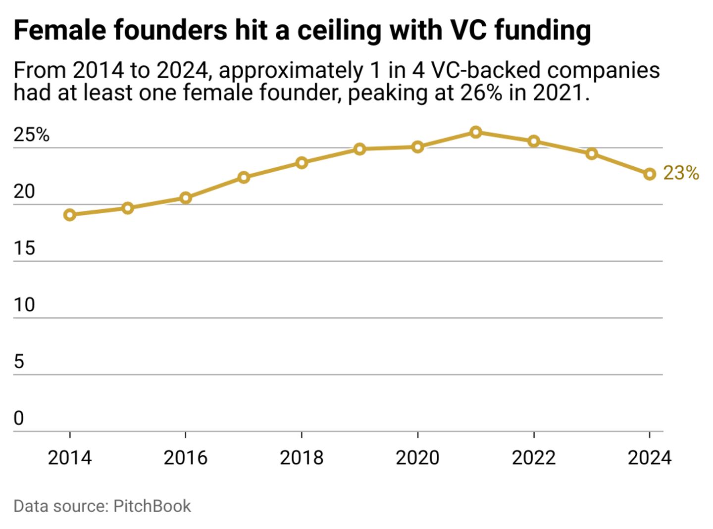 Women-led startups also seem to be held to a higher standard that allows no mistakes to be made. In 2024, researchers from the Yale School of Management, University of Toronto, and Columbia examined data from LinkedIn and PitchBook, found that women get 22% less funding than male founders if a venture firm has had negative experiences with an unrelated woman-led startup in the past.