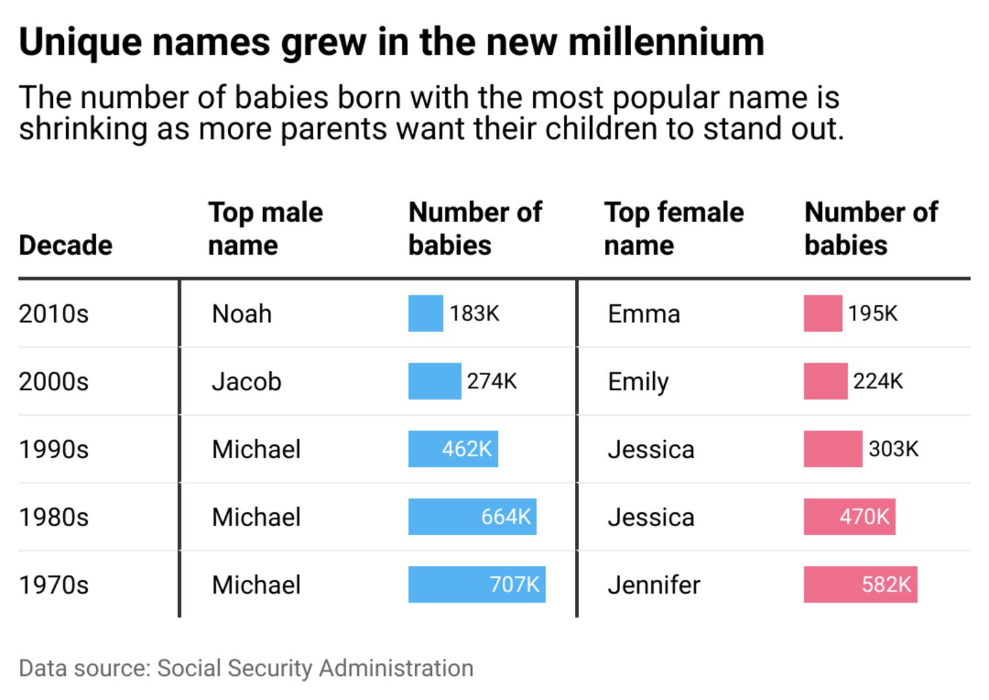 Editor's note: The Social Security Administration collects data on baby names based on a binary understanding of sex and gender; however, we recognize that names aren't inherently gendered.